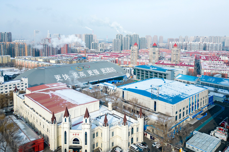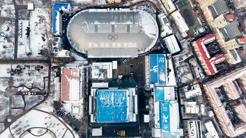这是1月21日拍摄的哈尔滨市冰球馆(男子冰球比赛场馆)(无人机照片)。